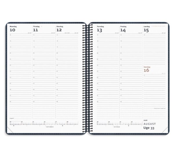 Mål: 250 x 175 x 20 mm. Layout: Uge/opslag. Højformat. Timeinddeling 8-18. Kalendarium: 2026-01-01 – 2026-12-31. Omslag: Kunstlæder. Spiralbundet. Detaljer: Plastlomme. Indhold: Månedsoversigter. Sideantal: 136 + 20. Miljøoplysninger: FSC® papir. Varemærke: Mayland.