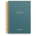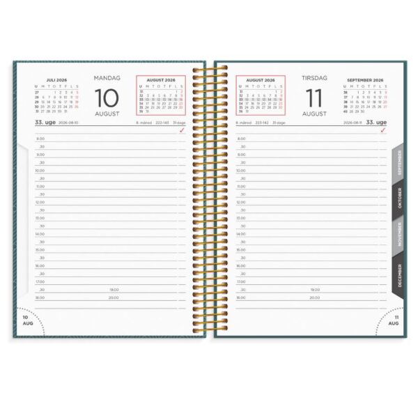 Mål: 179 x 137 x 24 mm. Layout: Dag/side. Højformat. Timeinddeling 8-20. Kalendarium: 2026-01-01 – 2026-12-31. Omslag: Karton med blød overflade. Spiralbundet. Detaljer: Plastlomme. Indhold: Månedsregister. Sideantal: 404 + 12 pl. Miljøoplysninger: FSC®. Varemærke: Mayland.