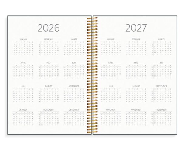 Format: A5. Mål: 216 x 170 x 23 mm. Layout: Uge/opslag. Tværformat. Kalendarium: 2026-01-01 – 2026-12-31. Omslag: Karton med struktur. Spiralbundet. Detaljer: Elastik. Flytbare plastfaner. Indhold: Årsoversigter. Sideantal: 256. Miljøoplysninger: FSC®. Varemærke: Mayland.