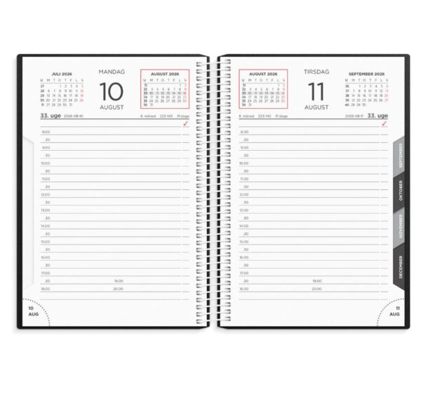 Klassisk spiralkalender. Kalenderen er spiralbundet med et omslag i hård PP-plast, hvilket giver kalenderen et enkelt udseende. Kalenderen er inddelt med en dag pr. side og indeholder et kalenderskema med halvtimeinddeling fra kl. 8-20, så du nemt kan danne dig et overblik over dagens planer og aftaler. Dertil finder en udfoldelig årsoversigt, masser af skriveplads, praktiske informationer samt hjørneperforering og månedsregister, som sikrer hurtige opslag i kalenderen.