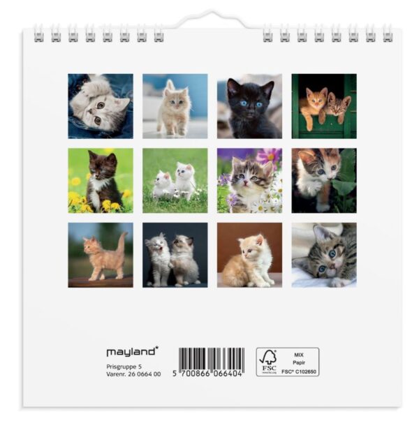 Vægkalender i karton med søde billeder af kattekillinger. Kalenderen er spiralindbundet og giver dig en oversigt over 1 måned ad gangen med plads til noteringer, så du hurtigt og nemt kan skabe et godt overblik over den enkelte måned.