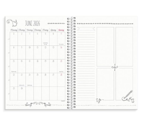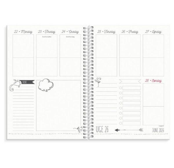 Format: A5. Mål: 212 x 167 x 21 mm. Layout: Uge/opslag. Højformat. Kalendarium: 2026-01-01 – 2026-12-31. Omslag: Karton med blød overflade. Spiralbundet. Detaljer: Elastik. Flytbar plastlineal. Papirlomme. Indhold: Stickersark. Sideantal: 160. Miljøoplysninger: FSC®. Varemærke: Mayland.