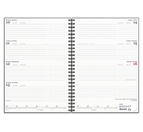 International ugekalender. Kalenderen er spiralbundet med et omslag i kraftigt genbrugskarton og indeholder både danske og engelske betegnelser samt internationale helligdage. Kalenderen har desuden en sort elastik, så den nemt holdes lukket. Kalenderen er inddelt med en uge pr. opslag og indeholder et timeopdelt kalenderskema fra kl. 8-18 i morderne layout, så du får et godt overblik over ugens planer og aktiviteter. Dertil finder du en tidslinje og en månedsoversigt nederst på hvert opslag, en udfoldelig årsplanner, en projektplanner, månedsoversigter, et atlas i farver, masser af praktisk information, lynopslag samt en lomme til løse papirer.