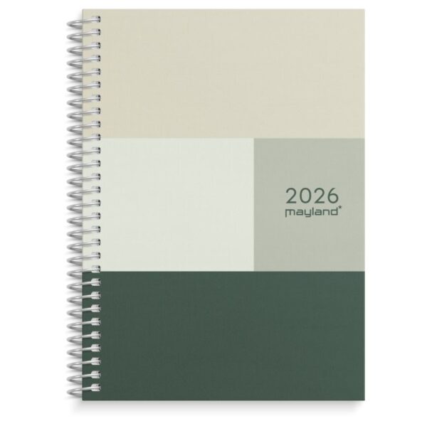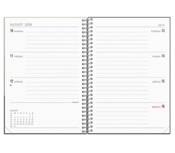 Format: A6. Mål: 151 x 117 x 14 mm. Layout: Uge/opslag. Tværformat. Kalendarium: 2026-01-01 – 2026-12-31. Omslag: Karton med struktur. Spiralbundet. Detaljer: Papirlomme. Indhold: Praktiske informationer. Sideantal: 128. Miljøoplysninger: FSC®. Varemærke: Mayland.