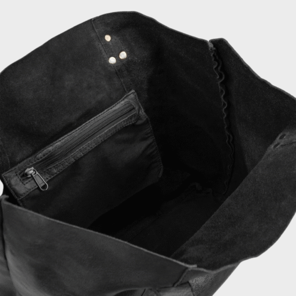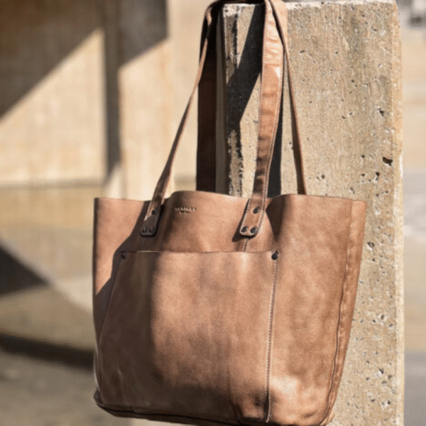 Amber shopper í bleytum og lekkrum búffilsleðri. Eitt rúmligt høvuðsrúm við einkultum snarlás lumma innan. Ein opin lummi framman.