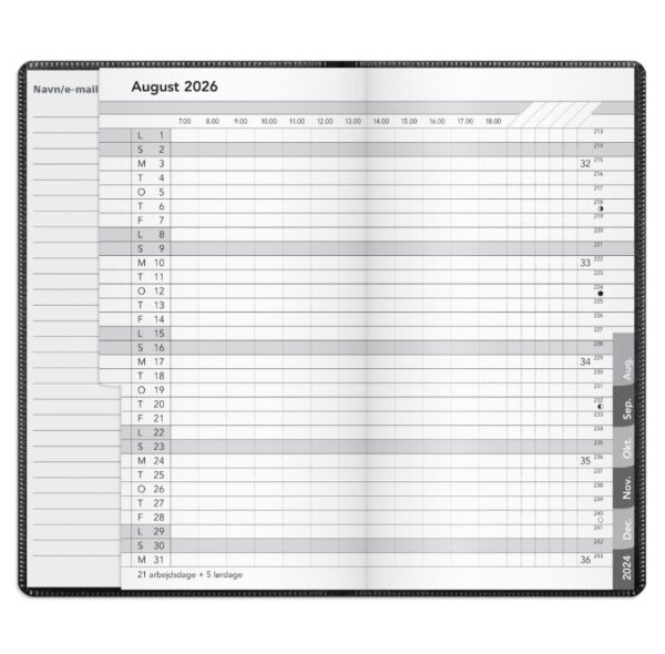 Mål: 175 x 100 x 6 mm. Layout: Måned/opslag. Tværformat. Timeinddeling 7-18. Kalendarium: 2026-01-01 – 2026-12-31. Omslag: PP-plast. Hæftet. Sideantal: 36. Miljøoplysninger: FSC®. Varemærke: Mayland.