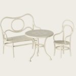 Café møbler der passer til mus i lillesøster og lillebror størrelse. Sættet består af en bænk, en stol og et bord og er det perfekte sted at nyde en eftermiddagssnack.