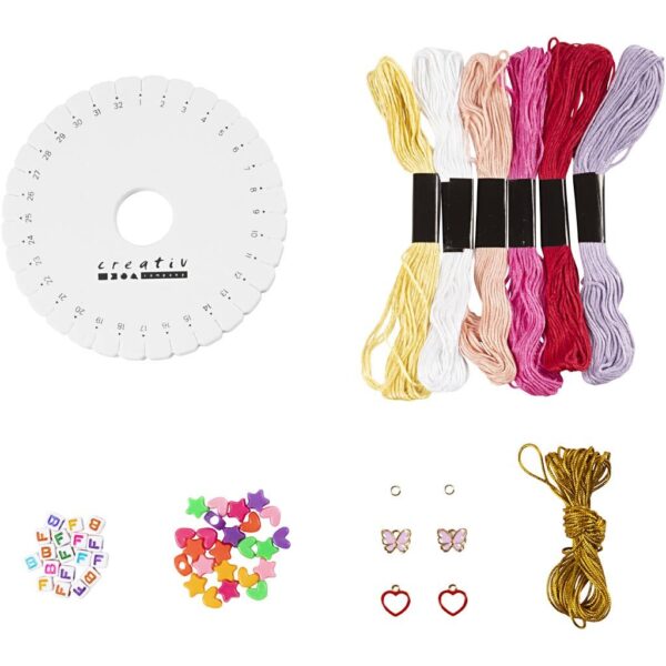 Innihald: Kumihimo vevbretti, strengur, figurperlur, bókstavperlur, sjarmur og knútaleiðbeining.