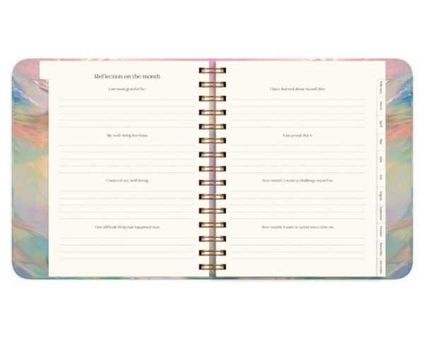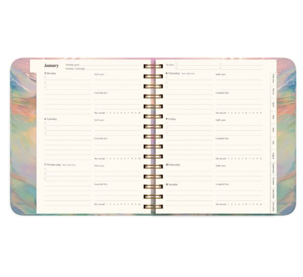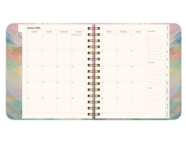 Mål: 216 x 190 x 35 mm. Layout: Uge/opslag. Kalendarium: 2025-12-29 – 2027-01-03. Omslag: Karton med blød overflade. Spiralbundet. Detaljer: Elastik. Indhold: Sprog engelsk, oversigt over internationale helligdage, årsoversigt/årsoversigter, årsplan/årsplaner, stickersark. Sideantal: 224. Miljøoplysninger: FSC®. Varemærke: Burde.
