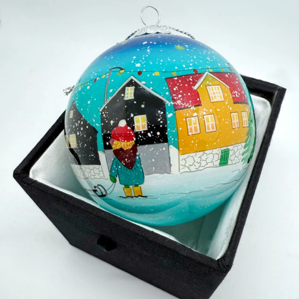 Hetta vakra hondblásta glasprýðið er sniðgivið av Suffía Nón og hondmálað av einum dugnaligum málara. Prýðið er innanmálað við boygdum penslum, sum eru settir inn gjøgnum opið í glasinum. Ongar tvær kúlur eru nakrantíð eins. Kúlan kemur í lekkrari gávueskju.