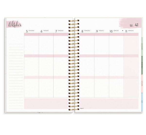 Kreativ life planner. Kalenderen er spiralbundet med et flot omslag i karton, hvilket giver kalenderen et stilrent udseende. Kalenderen er til dig, der sætter pris på at kunne planlægge din hverdag og have styr på dit liv. Du får rig mulighed for at lave egne lister og sætte kulør på din daglige planlægning. Skriv ugens planer ned, lav madplaner eller noter ugens højdepunkter. Du kan desuden let bladre mellem månederne via de farvelagte faneblade i fine pastelfarver. Kalenderen er opdelt med en uge pr. opslag og indeholder ugeopslag, månedsopslag, årsoversigter, notatsider samt 3 stickerark til at gøre planlægningen lettere og udseendet sjovere. Bagerst i kalenderen er der en smart lomme til løse papirer.