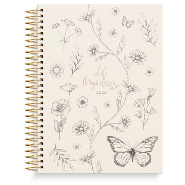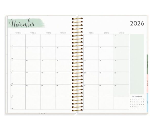 Format: C5 (162×229 mm). Mål: 235 x 190 x 28 mm. Layout: Uge/opslag. Højformat. Kalendarium: 2026-01-01 – 2026-12-31. Omslag: Karton med struktur. Spiralbundet. Detaljer: Papirlomme. Indhold: Månedsoversigt, årsoversigter, månedplanlægning, månedsfaner, notatsider, stickersark, årsplan. Sideantal: 176. Miljøoplysninger: FSC®. Varemærke: Mayland.