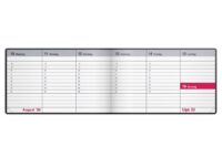 Smart minikalender med matsort forside. Kalenderen er spiralbundet med et omslag i genbrugskarton, hvilket giver kalenderen et enkelt udseende. Kalenderen er inddelt med en dag pr. side og indeholder et timeopdelt kalenderskema fra kl. 8-18 i moderne layout, så du nemt kan overskue dagens planer og aktiviteter. Dertil finder du en tidslinje og månedsoversigt nederst på hvert opslag, en udfoldelig årsoversigt samt masser af praktisk information.