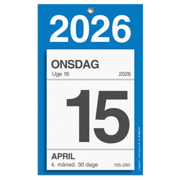 Afrivningskalender til vægophæng. Den smarte vægkalender har et praktisk blokformat, hvor hver side nemt kan rives af blokken, når dagen er gået. Afrivningskalenderen har et enkelt og moderne design med en blå baggrund og har bagsidetekster og et ugentligt krydsord.