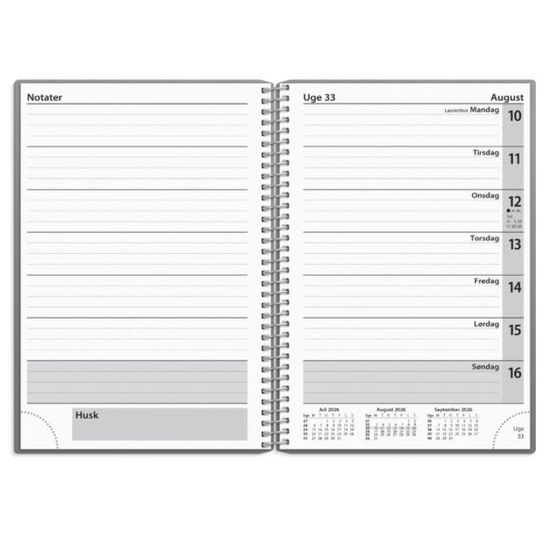 Struktureret ugekalender. Kalenderen er spiralbundet med et omslag i hård PP-plast, som gør kalenderen nem at bladre i. Kalenderen er inddelt med en uge pr. opslag og indeholder et klassisk kalenderskema i tværformat på højre side og en notatside på venstre side. Herved har du mulighed for løbende at skrive noter og huskelister til ugen. Dertil finder du en udfoldelig årsoversigt, et kalenderleksikon, månedlige regnskabsark og postnumre.