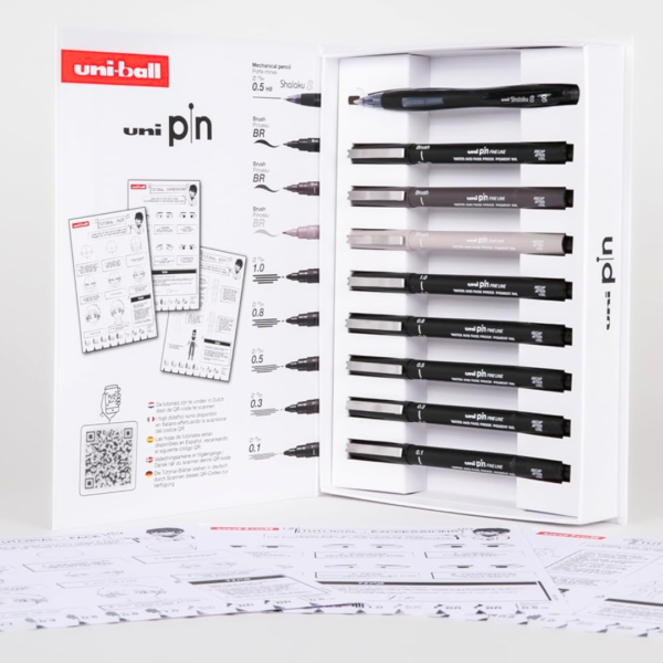 Teknipennar til yrkis- og hobby-listafólk. Vatnmótstøðuført blekk. Kann brúkast saman við akvarell – blekkið fánar ikki, tá tað er vátt. 3 fínir tips + 5 penslatips + 1 stiftblýantur