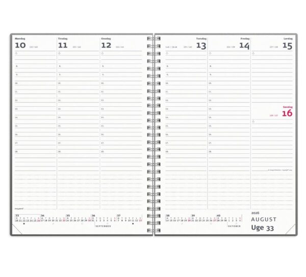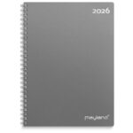 Format: A5. Mål: 215 x 160 x 13 mm. Layout: Uge/opslag. Højformat. Timeinddeling 8-18. Kalendarium: 2026-01-01 – 2026-12-31. Omslag: PP-plast. Spiralbundet. Detaljer: Plastlomme. Indhold: Månedsoversigter. Sideantal: 128 + 10-pl. Miljøoplysninger: FSC®. Varemærke: Mayland.